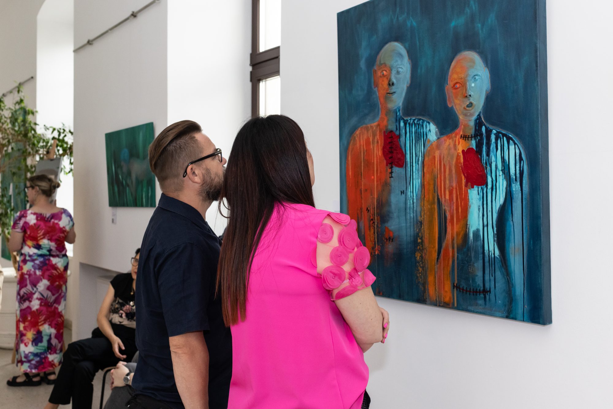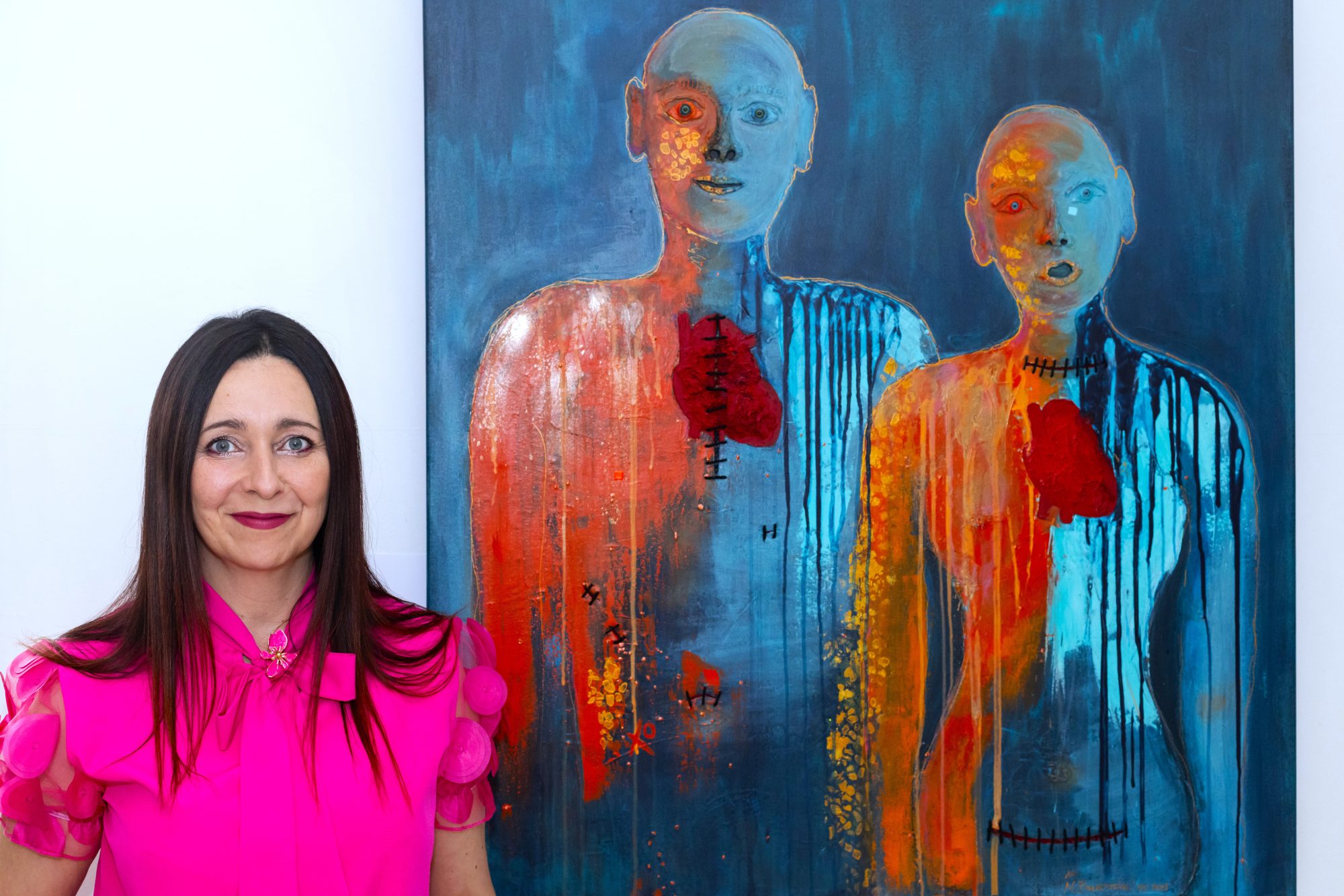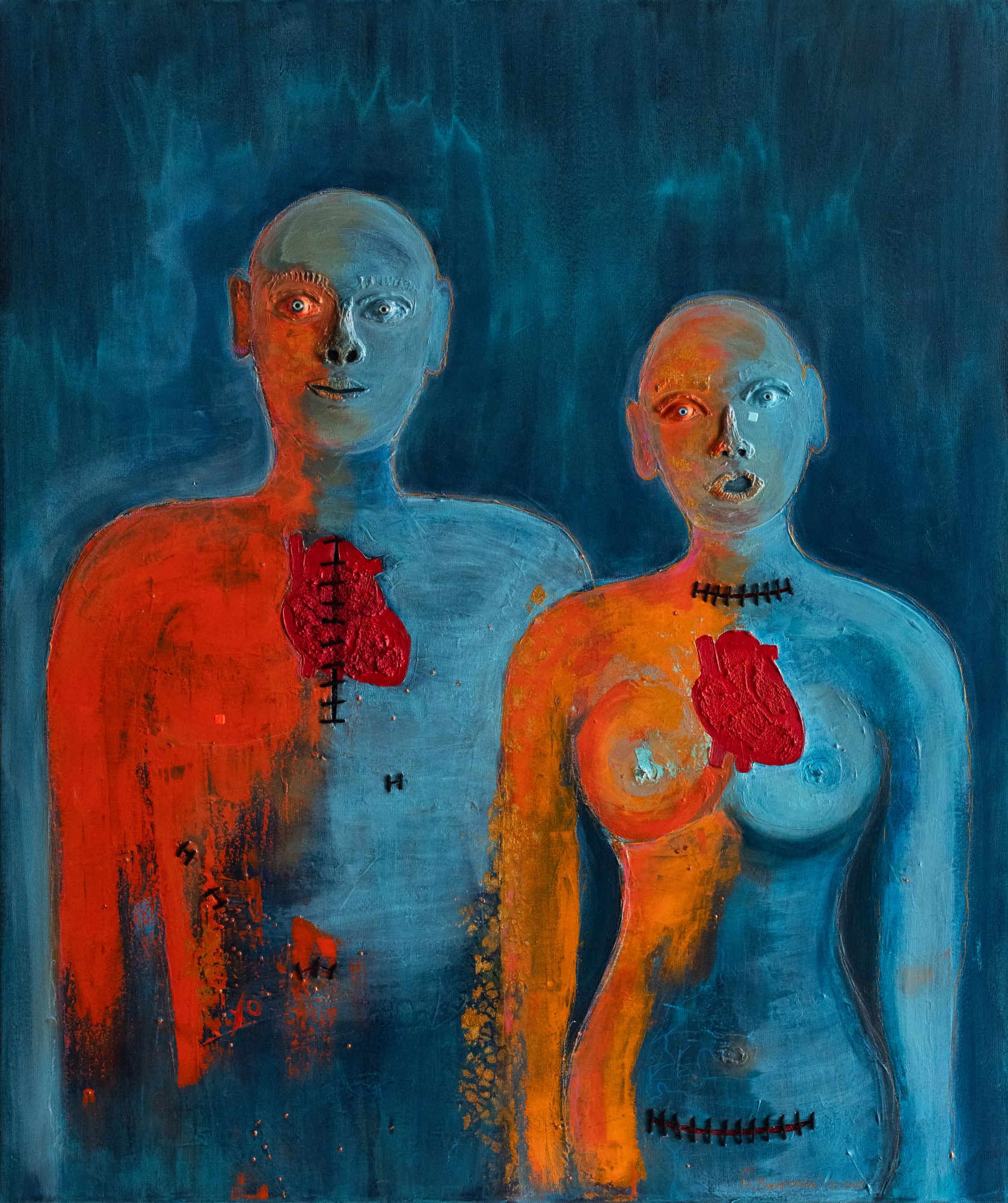 Dwie postaci stoją w ciszy, ich łyse głowy przypominają pacjentów w trakcie chemioterapii, a łza spływająca po twarzy kobiety jest znakiem bólu, ale też oczyszczenia. Niebieskie smugi, które powstały dzień przed wernisażem, to metafora zimnych potów, które pojawiają się w chorobie i lęku, a pomarańczowe plamy rozgrzewają płótno jak trawiąca ciało gorączka – objaw wielu schorzeń, kiedy ciało walczy o przetrwanie.