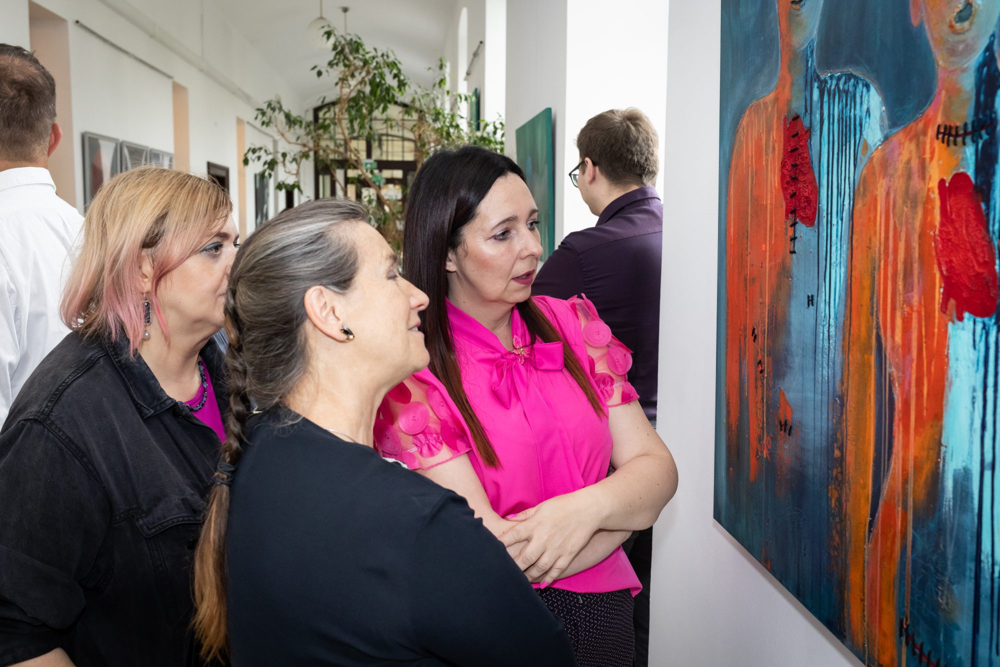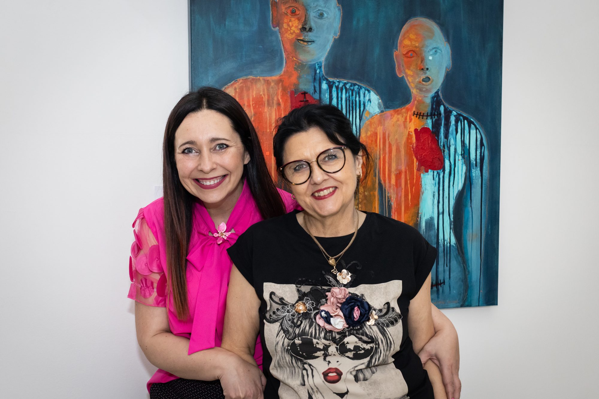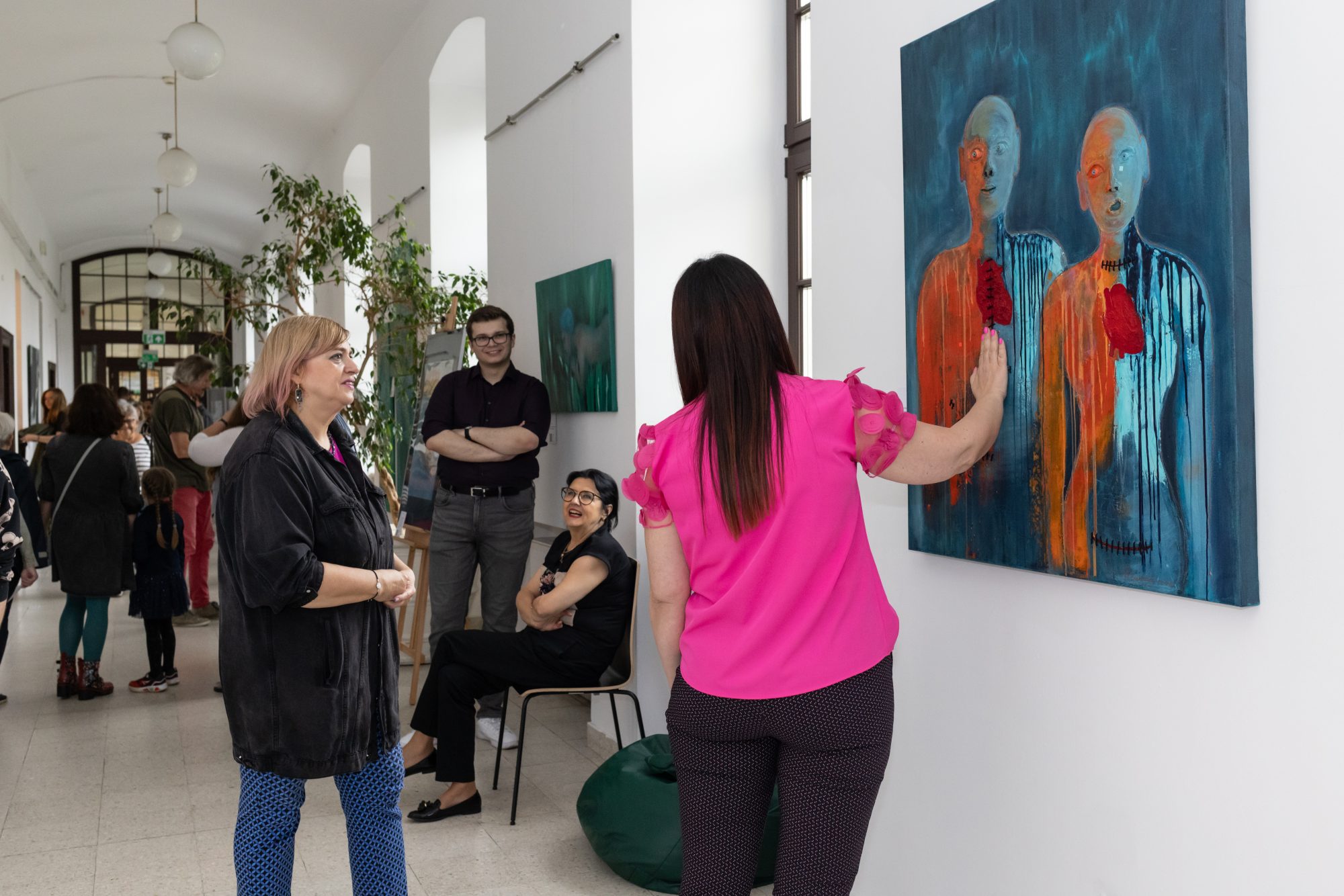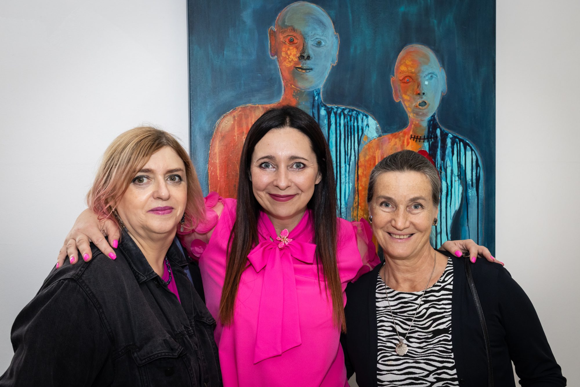 Dwie postaci stoją w ciszy, ich łyse głowy przypominają pacjentów w trakcie chemioterapii, a łza spływająca po twarzy kobiety jest znakiem bólu, ale też oczyszczenia. Niebieskie smugi, które powstały dzień przed wernisażem, to metafora zimnych potów, które pojawiają się w chorobie i lęku, a pomarańczowe plamy rozgrzewają płótno jak trawiąca ciało gorączka – objaw wielu schorzeń, kiedy ciało walczy o przetrwanie.