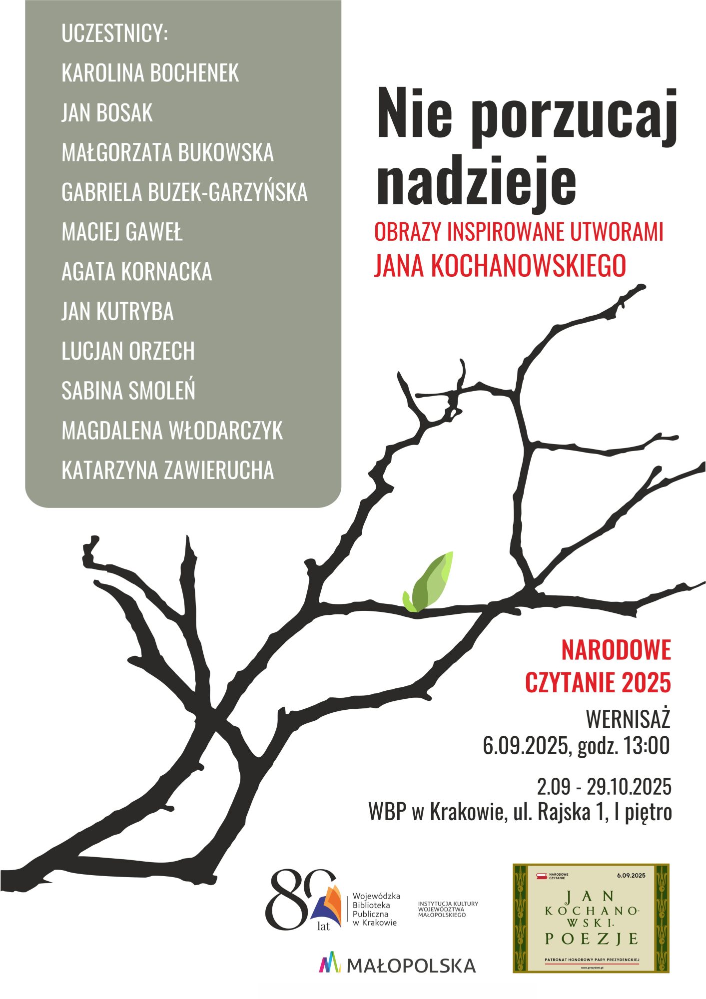 W dniach 2 września – 29 października 2025 roku w Wojewódzkiej Bibliotece Publicznej w Krakowie przy ul. Rajskiej 1, odbyła się wystawa zbiorowa „Nie porzucaj nadzieje”, przygotowana w ramach ogólnopolskiej akcji Narodowego Czytania. Artyści malarze zostali zaproszeni do twórczego dialogu z poezją Jana Kochanowskiego, aby w języku współczesnej sztuki malarskiej odkrywać ponadczasowe znaczenie jego słów. Bardzo dziękuję za to zaproszenie.